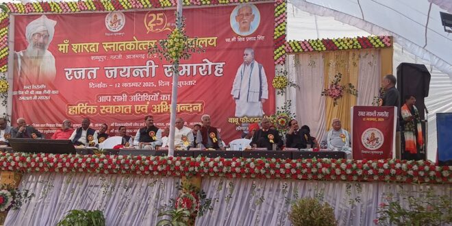 अहरौला आजमगढ़ । मां शारदा महाविद्यालय शंभूपुर गहजी में रजत जयंती को लेकर एक समारोह का आयोजन कर बड़े उत्साह के साथ ज्यंति मनायी गई कार्यक्रम दो सत्रों में संपन्न हुआ। प्रथम सत्र में बौद्धिक गोष्ठी आयोजित की गई जबकि सायं 6 बजे से कवि सम्मेलन एवं लोकनृत्य का आयोजन हुआ बौद्धिक कार्यक्रम में मुख्य अतिथि के रूप में वीर बहादुर सिंह पूर्वांचल विश्वविद्यालय के पूर्व कुलपति प्रो. नरेश गौतम, विशिष्ट अतिथि के रूप में महाराजा सुहेलदेव विश्वविद्यालय, आजमगढ़ के कुलपति प्रो. संजीव कुमार, तथा जननायक चंद्रशेखर विश्वविद्यालय, बलिया के कुलपति प्रो. संजीत कुमार गुप्ता सहित कई गणमान्य व्यक्ति उपस्थित रहे।