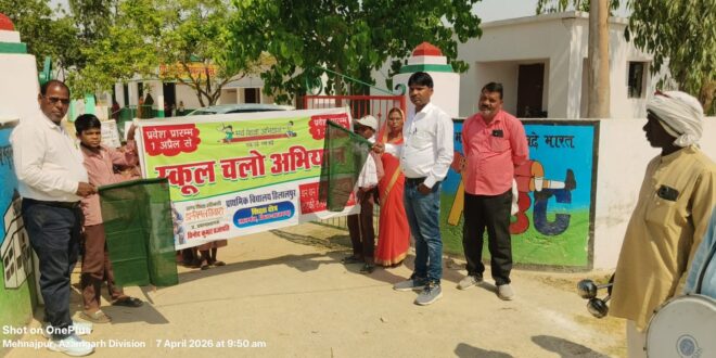 मेहनाजपुर सिधौना। प्राथमिक विद्यालय हिलालपुर लालगंज में स्कूल चलो अभियान के अंतर्गत आज हिलालपुर के छात्रों एवं अध्यापकों के द्वारा गांव-गांव भ्रमण कर नामांकन के प्रति जागरूकता अभियान चलाया गया जिसका शुभारंभ आनंद कुमार ग्राम प्रधान विशंभरपुर निहारी ने झंडी दिखाकर अभियान की शुरुआत की उसके बाद भ्रमण करते-करते बच्चे व शिक्षक जब हिलालपुर ग्राम सभा में पहुंचे हिलालपुर के ग्राम प्रधान संतोष यादव उर्फ बेचू ने इनका स्वागत व सम्मान किया और अपने ग्राम सभा में इनको हरी झंडी दिखाकर ग्राम सभा का भ्रमण कराया इस मौके पर संतोष यादव ने कहा अपने ग्राम सभा के ज़्यादा से ज़्यादा बच्चो के नाम विद्यालय में लिखे जायेगे इस कार्यक्रम में प्रधानाध्यापक विनोद प्रजापति , सहायक अध्यापक शक्ति विजय यादव , रामसनेही प्रजापति एवं शिवम सरोज आंगनबाड़ी रामवती देवी एवं सुभावती देवी मौजूद रही